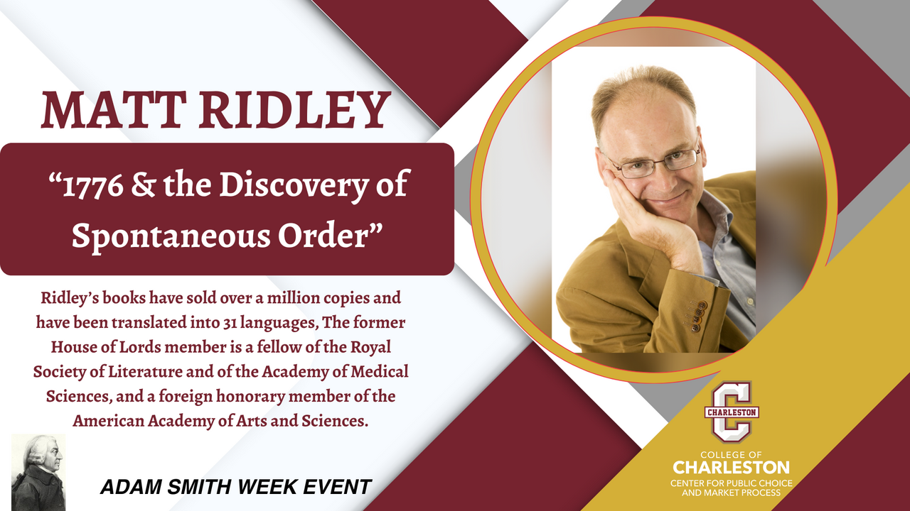 Time – 6:00PM welcome reception followed by dinner at 7:00PM featuring Matt Ridley author of “1776 & the Discovery of Spontaneous Order.”